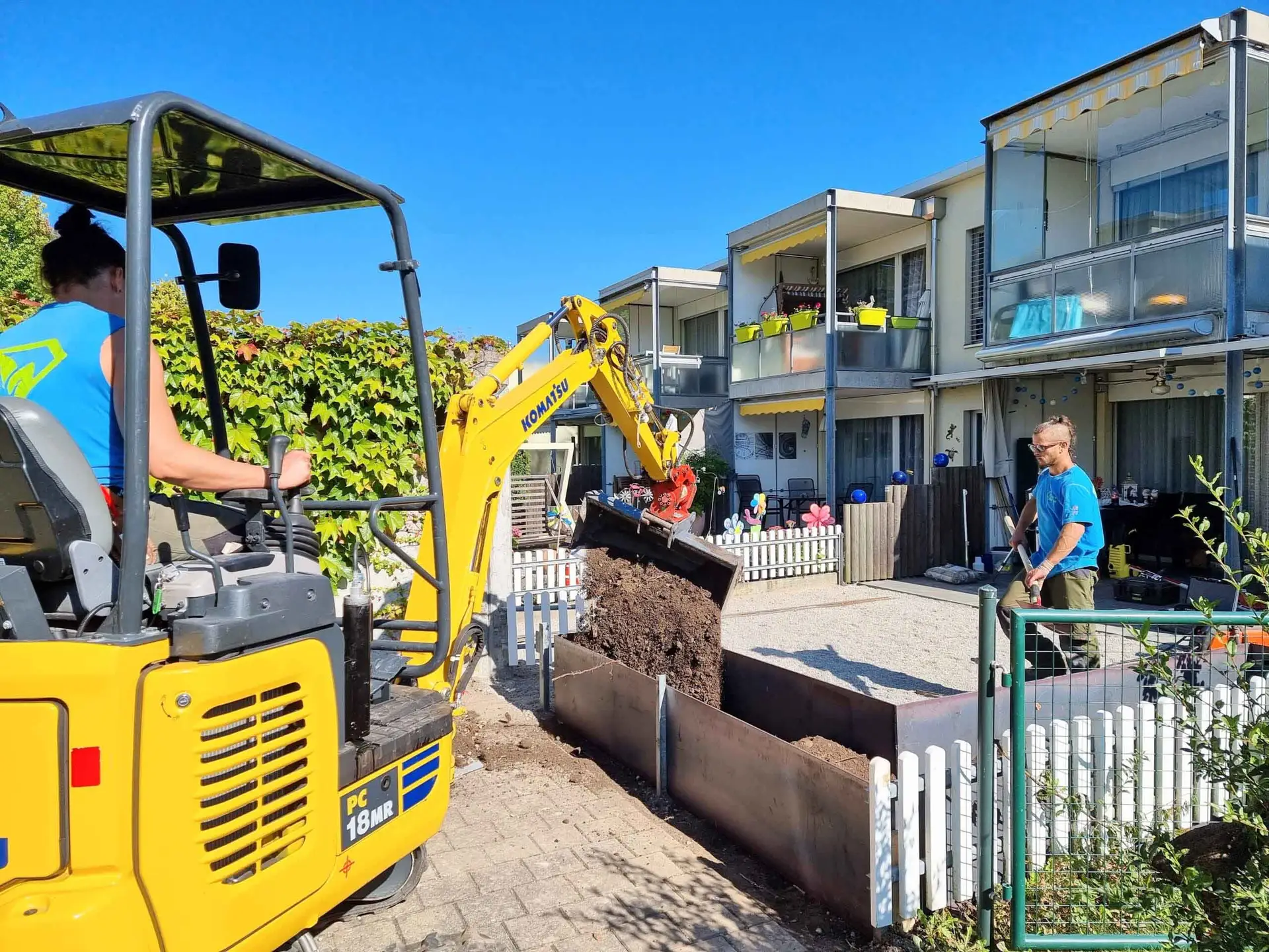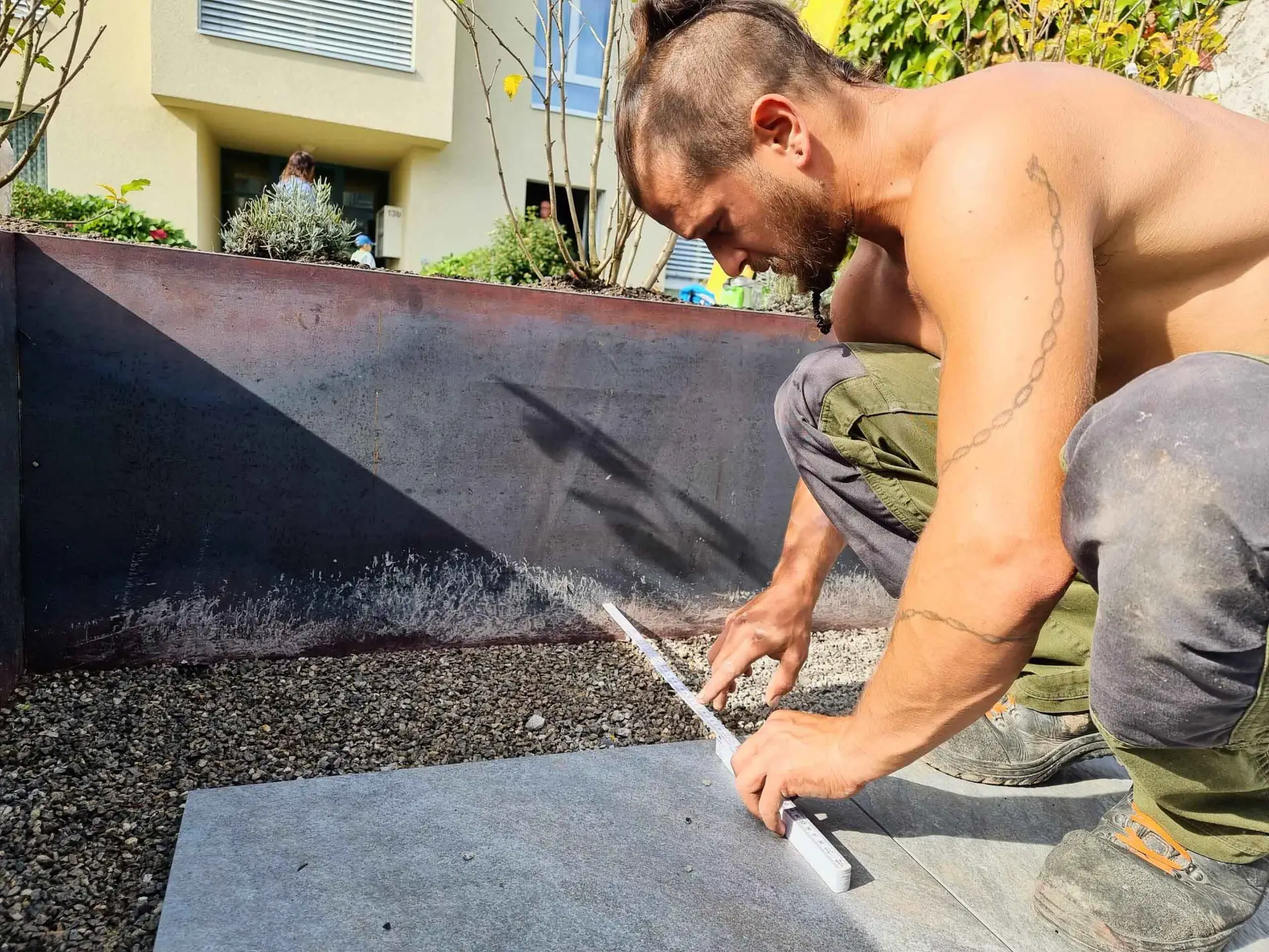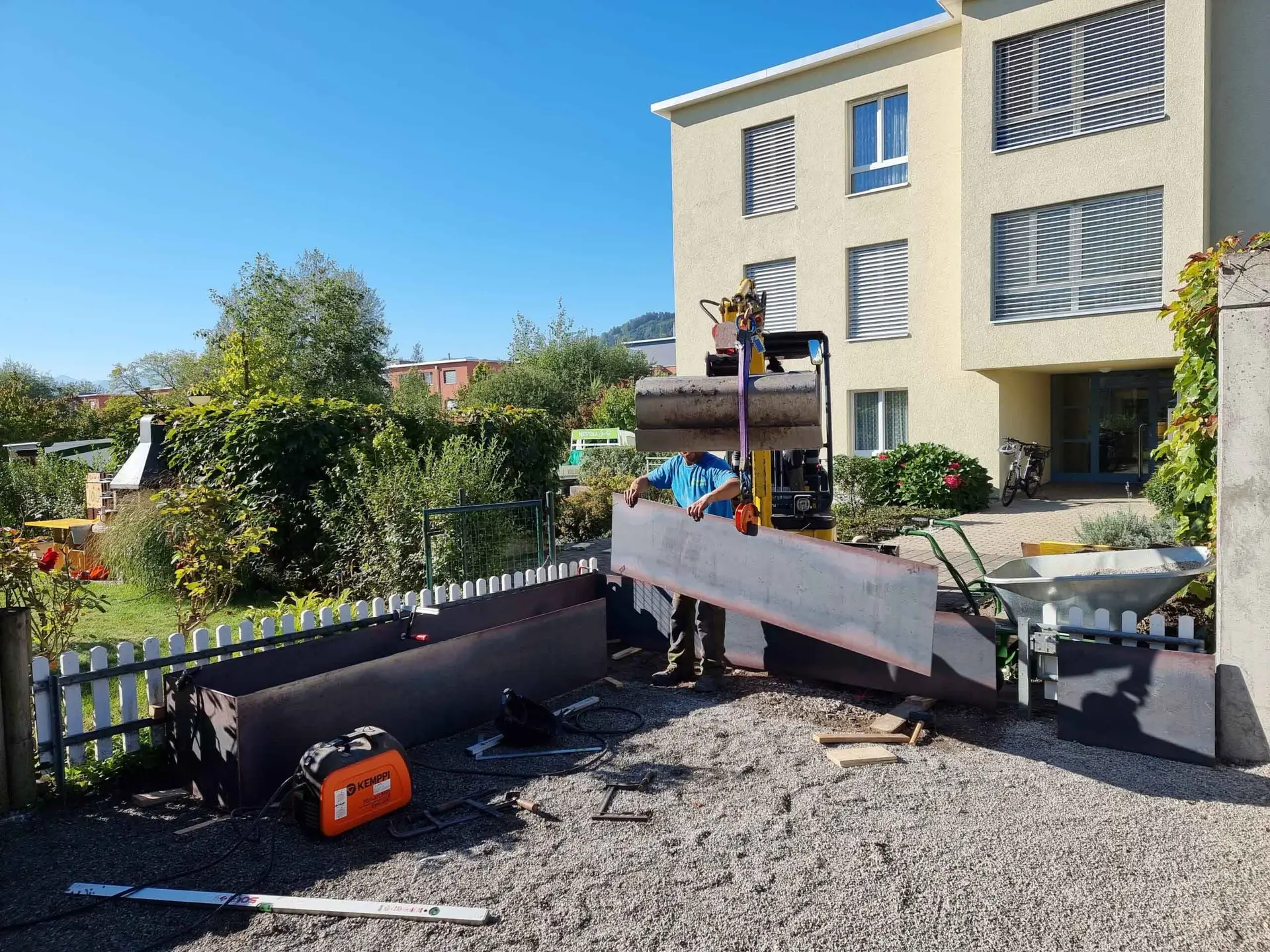 Ein kleiner Sitzplatz mit einem eleganten Hochbeet – klein, aber äußerst charmant. Die Hochbeete in Stahloptik verleihen diesem gemütlichen Eckchen nicht nur einen modernen Touch, sondern dienen auch als funktionale Gartenlösung. Die klare Linienführung und das kompakte Design machen diesen Sitzplatz zu einem kleinen Juwel im Garten, wo man in Ruhe verweilen und die Natur genießen kann.